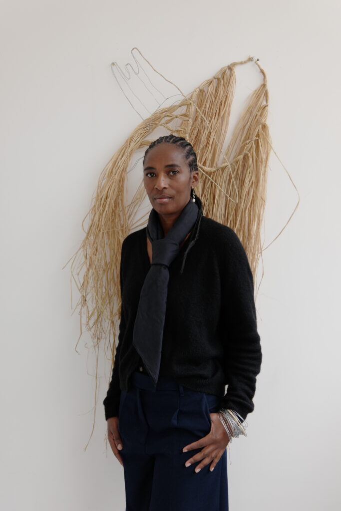 afrodescendante, la mémoire du corps et les liens entre nature, sacré et création. Sa pratique mêle textile, photographie performative, sculpture en fibres végétales et